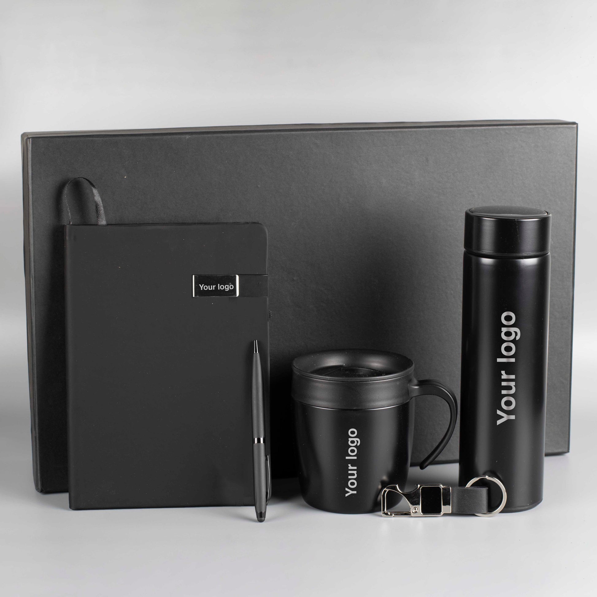 - Includes a diary, a pen, a keychain, a coffee mug and a temperature flask bottle